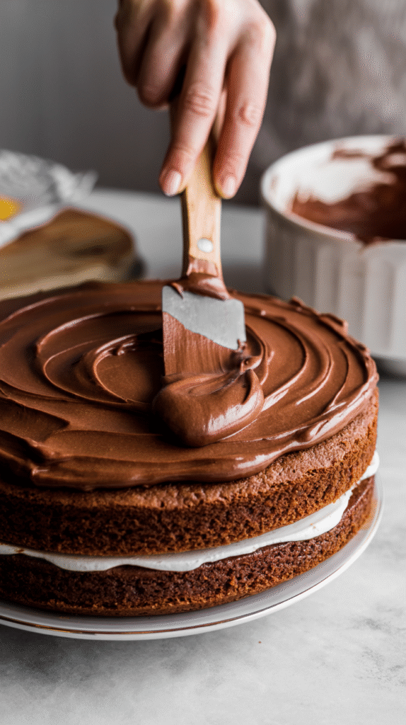 Place one cake layer on your stand or plate. Spread a generous amount of frosting on top, then stack the second layer. Frost the entire cake with love and zero restraint.