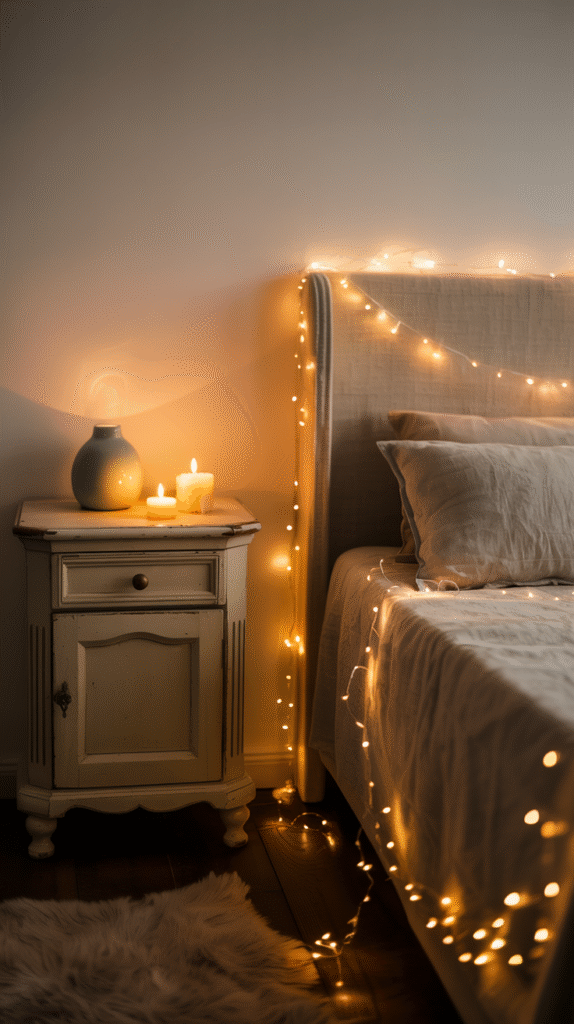- Accent lighting: fairy lights, candles, LED strips, or lamps. Adds mood and depth.