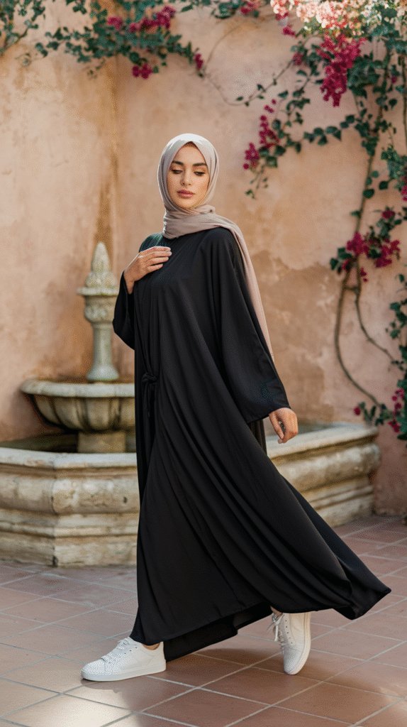 Opt for neutral abayas (black, beige, grey) and let your sneakers bring the pop—white leather, pastel accents, or even chunky soles. Add a matching jersey hijab, and you’re basically hijabi street-style goals.