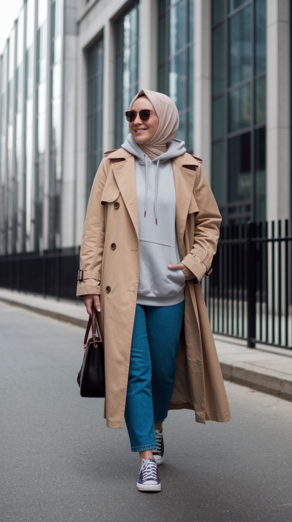 Pick a neutral hoodie (cream, grey, or even black), layer on a camel or khaki trench, and finish with white sneakers. Wrap it up with a jersey hijab for that laid-back feel.