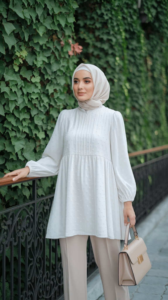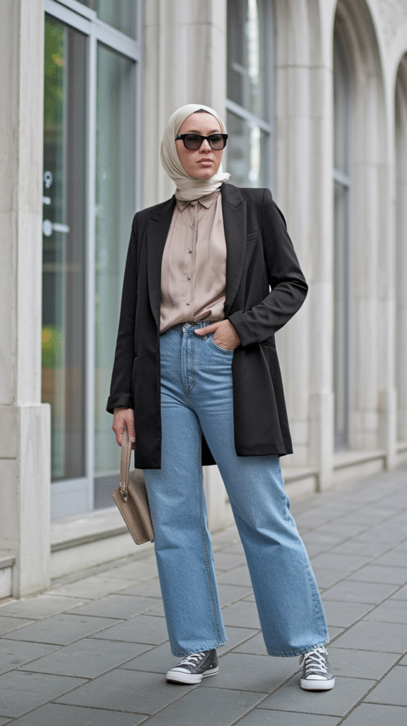 Pair it with a silky hijab for that glossy, elevated touch. Add white sneakers or loafers depending on your mood. Casual coffee run? Sneakers. Pretend you’re in Paris? Loafers.