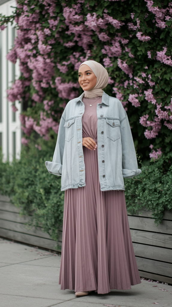 Play with textures here. A ribbed maxi dress + oversized light-wash denim jacket? Perfection. Tie it together with a solid hijab in a complementary shade (I’m talking earth tones or muted pastels).