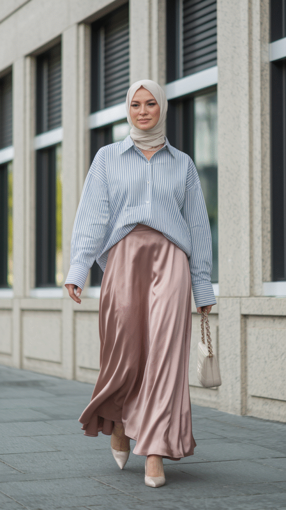 Try a white or striped shirt with a satin skirt. For hijab, stick to matte neutrals—the outfit is already making a statement, so keep the scarf chic but chill.